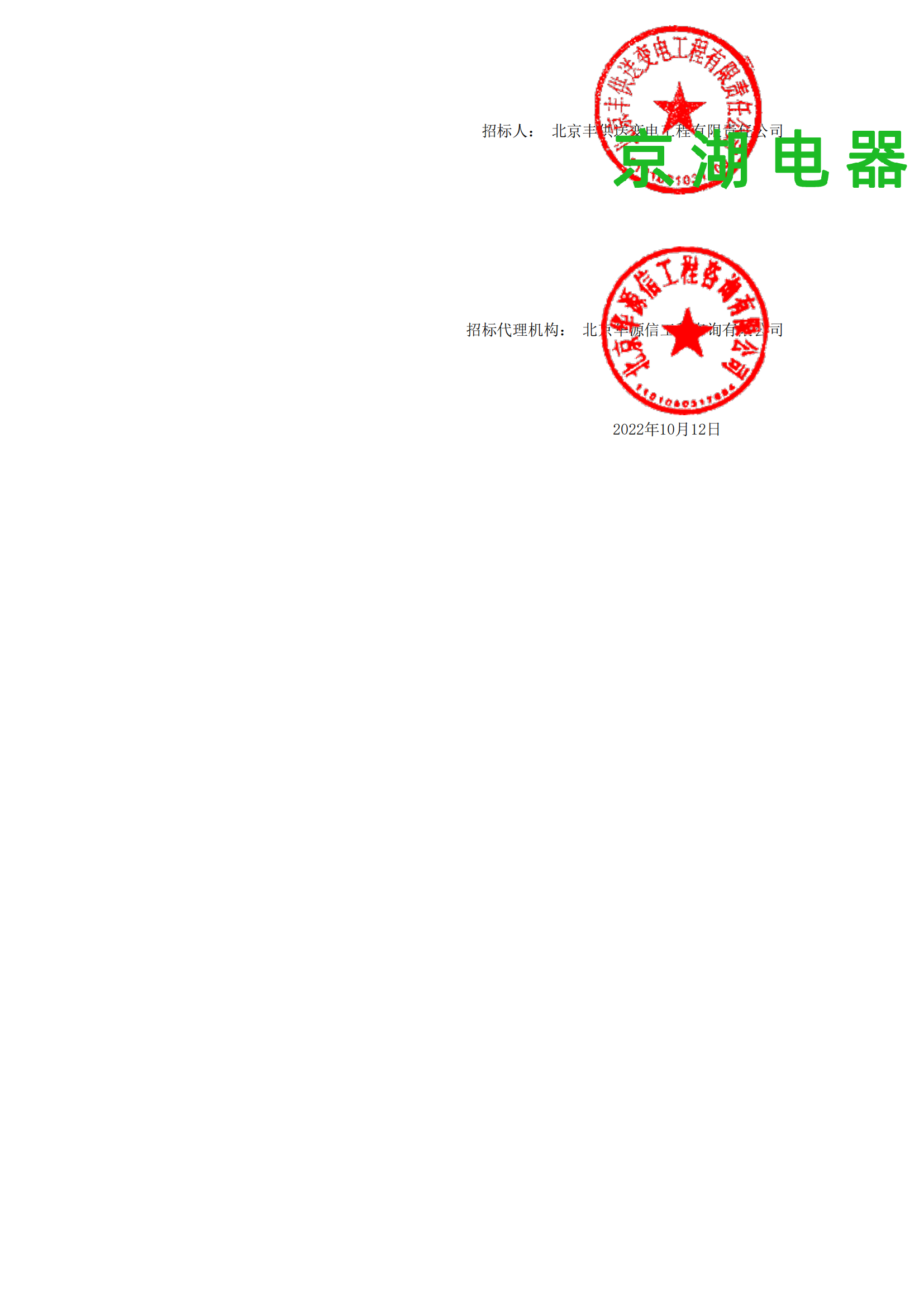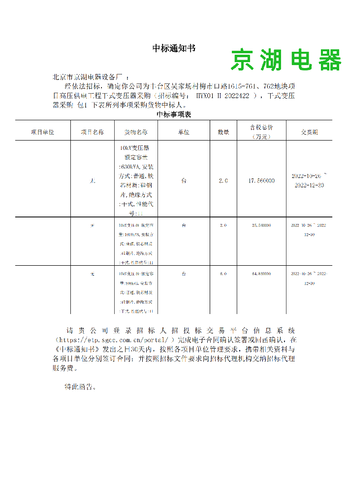 北京豐供送變電工程有限公司 中標通知書